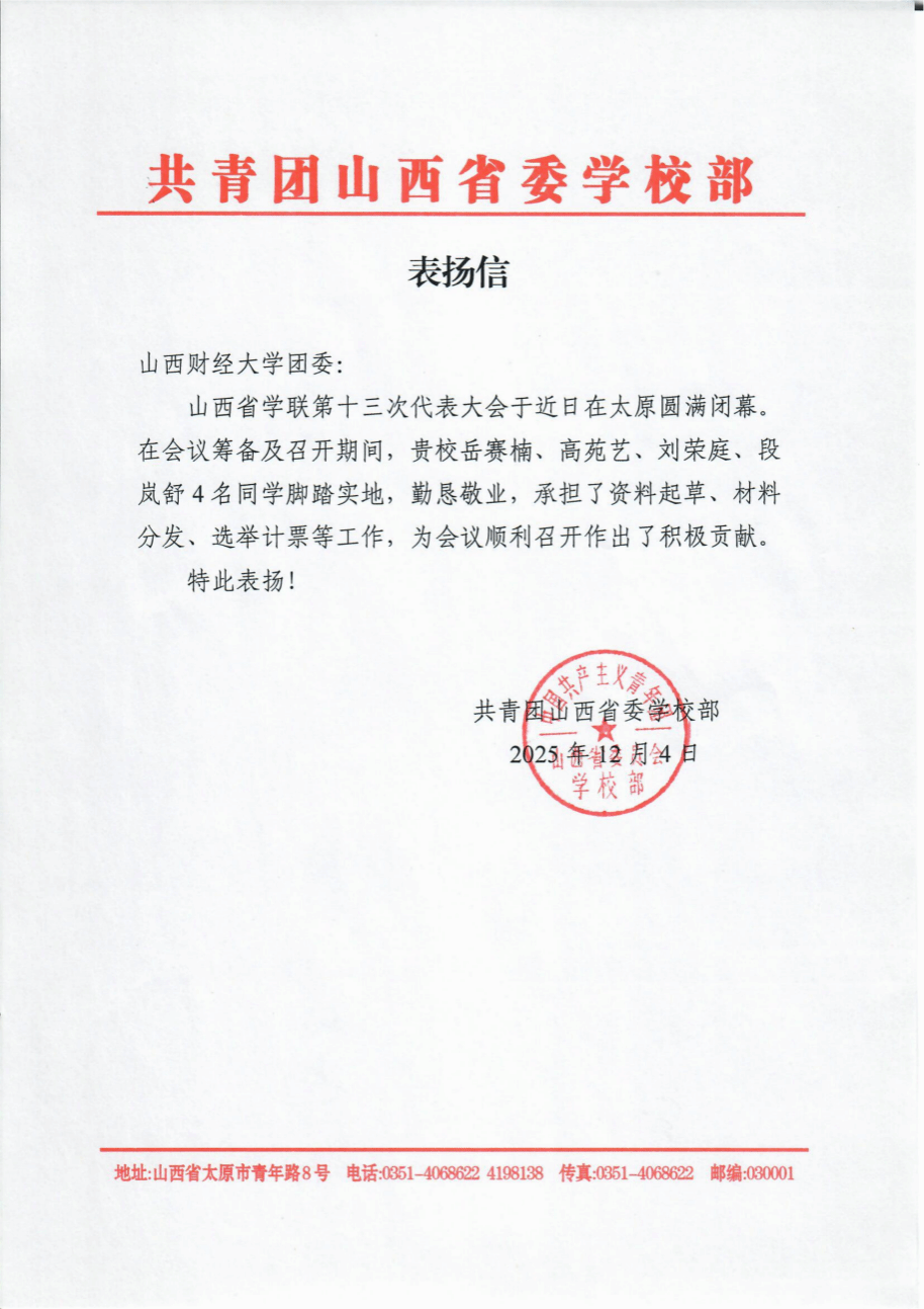 12月4日,共青团山西省委学校部向山西财经大学团委发来表扬信,对万博体育